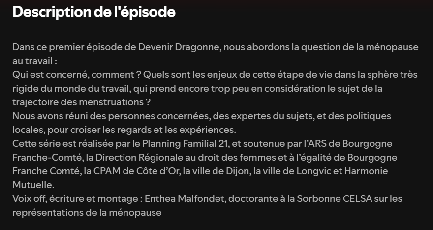 Ce podcast, réalisé Enthea Malfondet (doctorante à la Sorbonne CELSA sur les représentations de la ménopause) du Planning Familial 21, est soutenu par l’ARS de Bourgogne Franche-Comté, la Direction Régionale au droit des femmes et à l’égalité de Bourgogne Franche Comté, la CPAM de Côte d’Or, la ville de Dijon, la ville de Longvic et Harmonie Mutuelle.