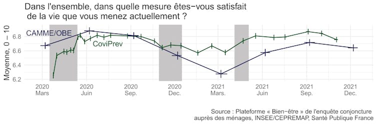 Ainsi, au printemps 2020, l’entrée en confinement a représenté un choc pour beaucoup de Français, qui ont dû s’adapter brutalement au travail à distance, à l’école à la maison et à la fermeture des lieux de sociabilité. L’enquête CoviPrev de Santé publique France montre ainsi un niveau de satisfaction dans la vie fortement déprimé dans les premières semaines du confinement au mois de mars et d’avril.