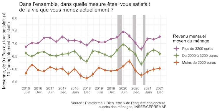 En outre, notre enquête de conjoncture suggère que l’épidémie a traversé l’ensemble de la société sans en modifier les stratifications sociales en termes bien-être. Ainsi, la satisfaction dans la vie moyenne est restée fortement différenciée selon le revenu du ménage, et les trois classes de revenu que nous distinguons ont connu des fluctuations parallèles et synchrones.